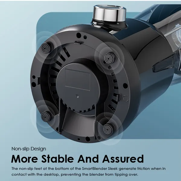 The non-slip feet at the bottom of the SmartBlender Sleek generate friction when in contact with the desktop, preventing the blender from tipping over.