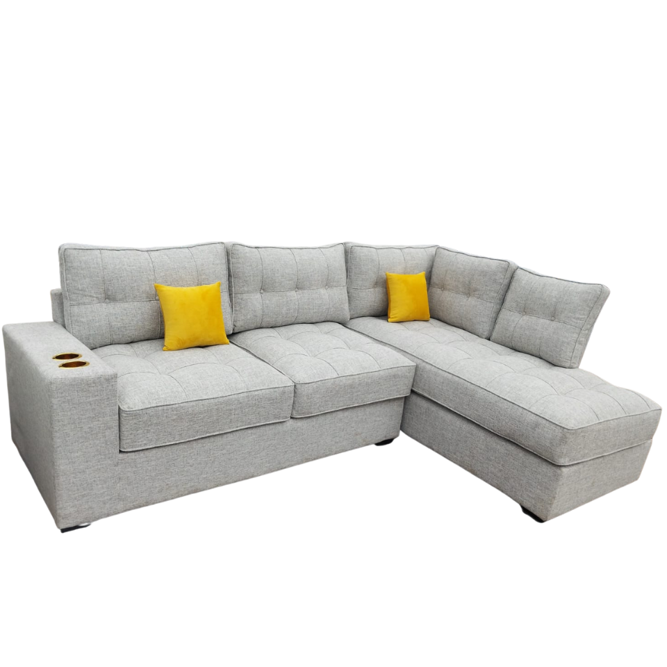 This premium sectional sofa is crafted with soft, durable woven fabric in a versatile grey shade that complements any décor theme. Its spacious L-shaped design provides ample seating for family gatherings, movie nights, or relaxing afternoons. Whether placed in a modern apartment or a large living room, it effortlessly becomes the centerpiece of your interior.